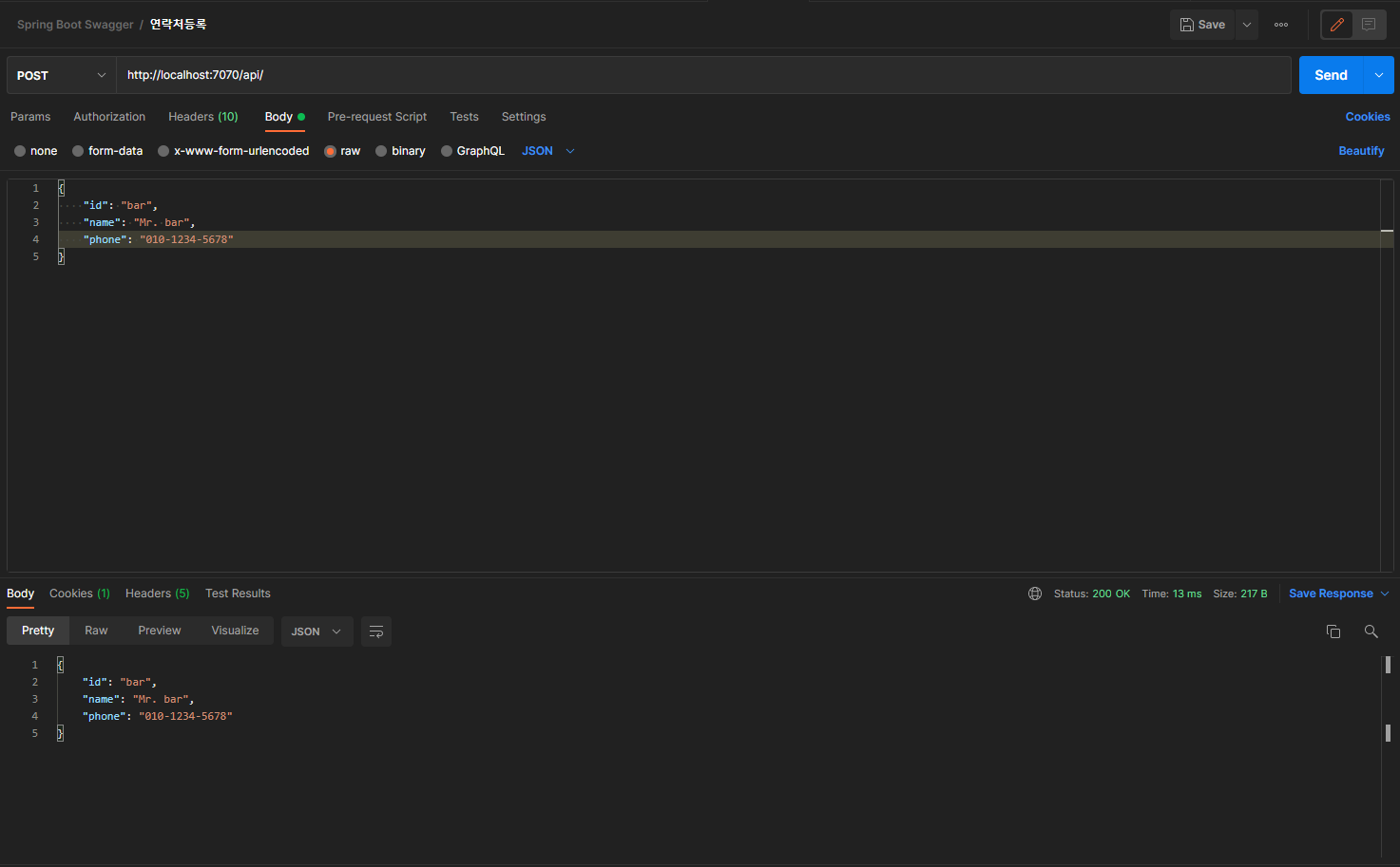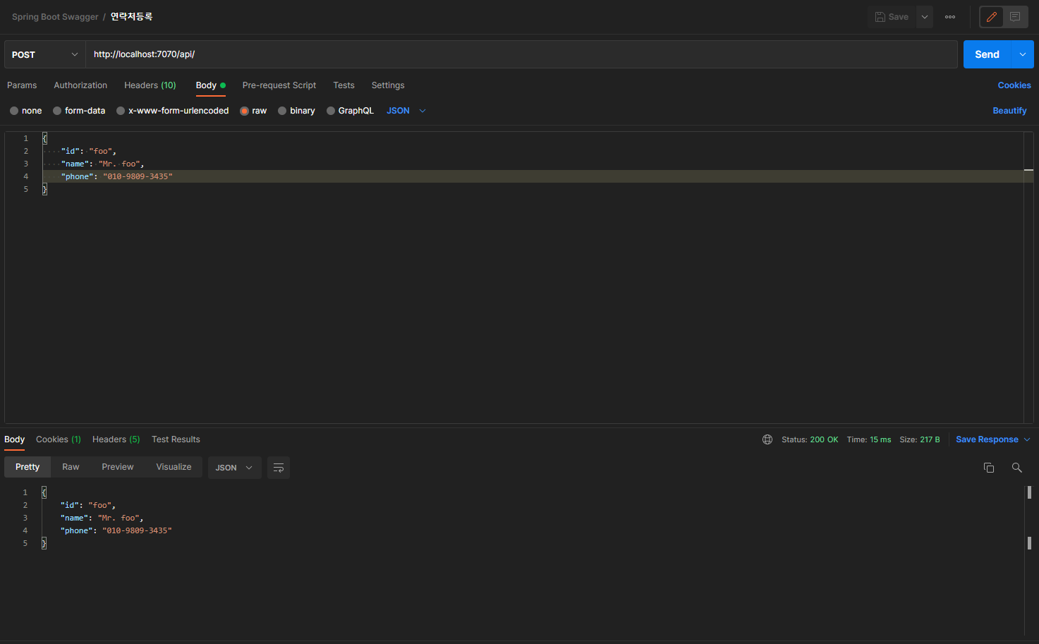 위의 결과를 보면 Postman에서 테스트했던 거와 마찬가지로 정상적으로 등록된 것을 확인할 수 있습니다.