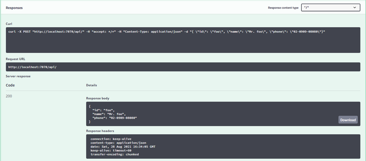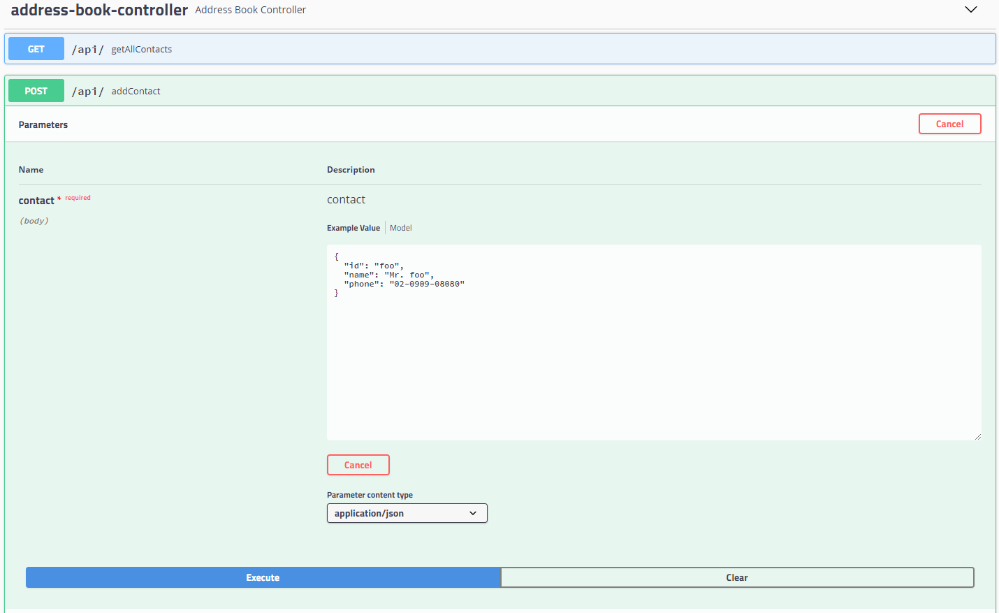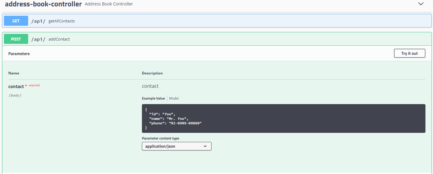 위와 같은 화면이 보이면 두 번째 addContact 부분 아래 Try it out 버튼을 누르면 테스트 파라미터를 입력할 수 있도록 화면이 전환이 됩니다.