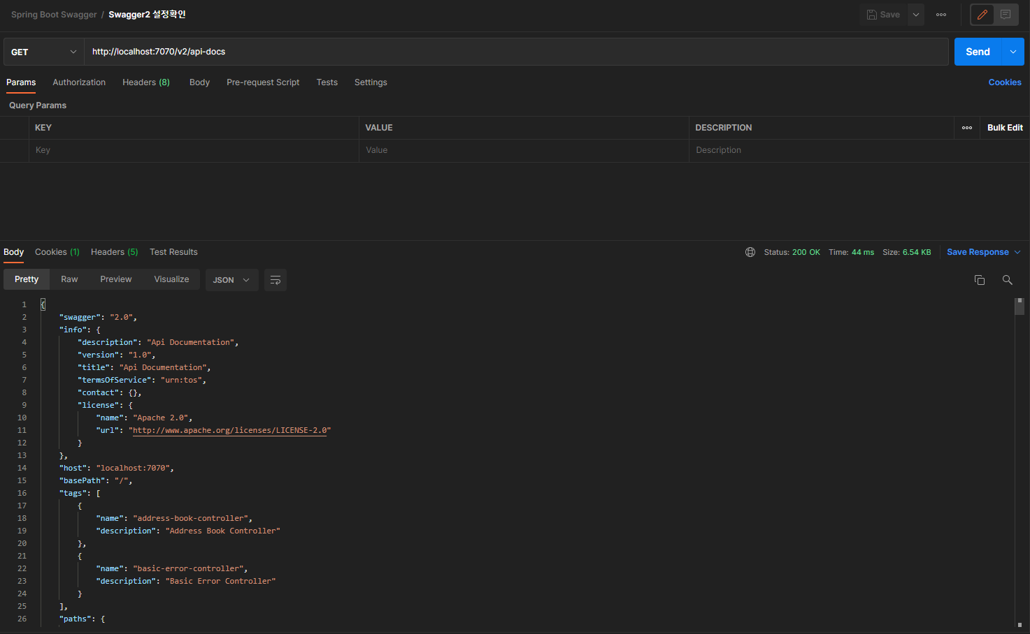 그리고 Postman에서 위의 URL /v2/api-docs를 호출하면 아래와 같이 보일 것입니다.