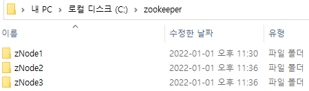 C:\zookeeper\zNode1, C:\zookeeper\zNode2, C:\zookeeper\zNode3 폴더를 만들어 줍니다.